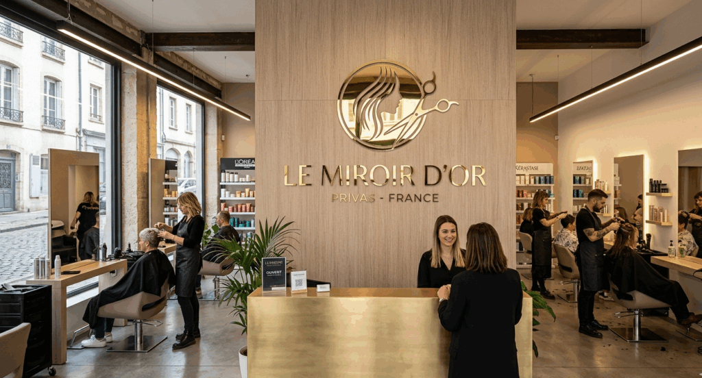 Dans un commerce, tout ne passe pas uniquement par la vitrine. Une fois la porte franchie, le client entre dans un univers. Le nom de la marque sur un mur, un mot fort derrière une caisse, une enseigne intérieure dans un salon de coiffure, un logo découpé dans un salon de thé ou une signalétique élégante à l’accueil participent immédiatement à l’ambiance du lieu.